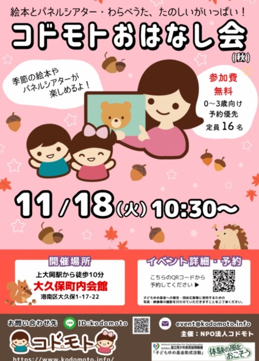 港南図書館などでおはなし会をしている「おはなしくまさん」と一緒に、季節に合わせた絵本の読み聞かせやわらべうた、手袋人形、パネルシアターを楽しむ会で、まだ字が読めない赤ちゃんでも、目や音でおはなし会をたのしむことができます。