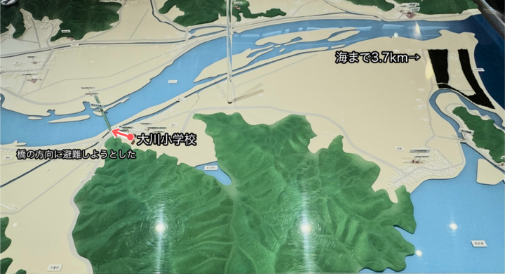 学校が逃げたのは、川の少し上流にある橋の方。しかし、そこを津波が迫ってきていたのです。これがもし、山へ逃げていたら、同じタイミングの判断だったとしても、もっと多くの子どもたちが難を逃れられていたでしょう。