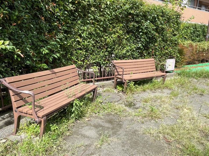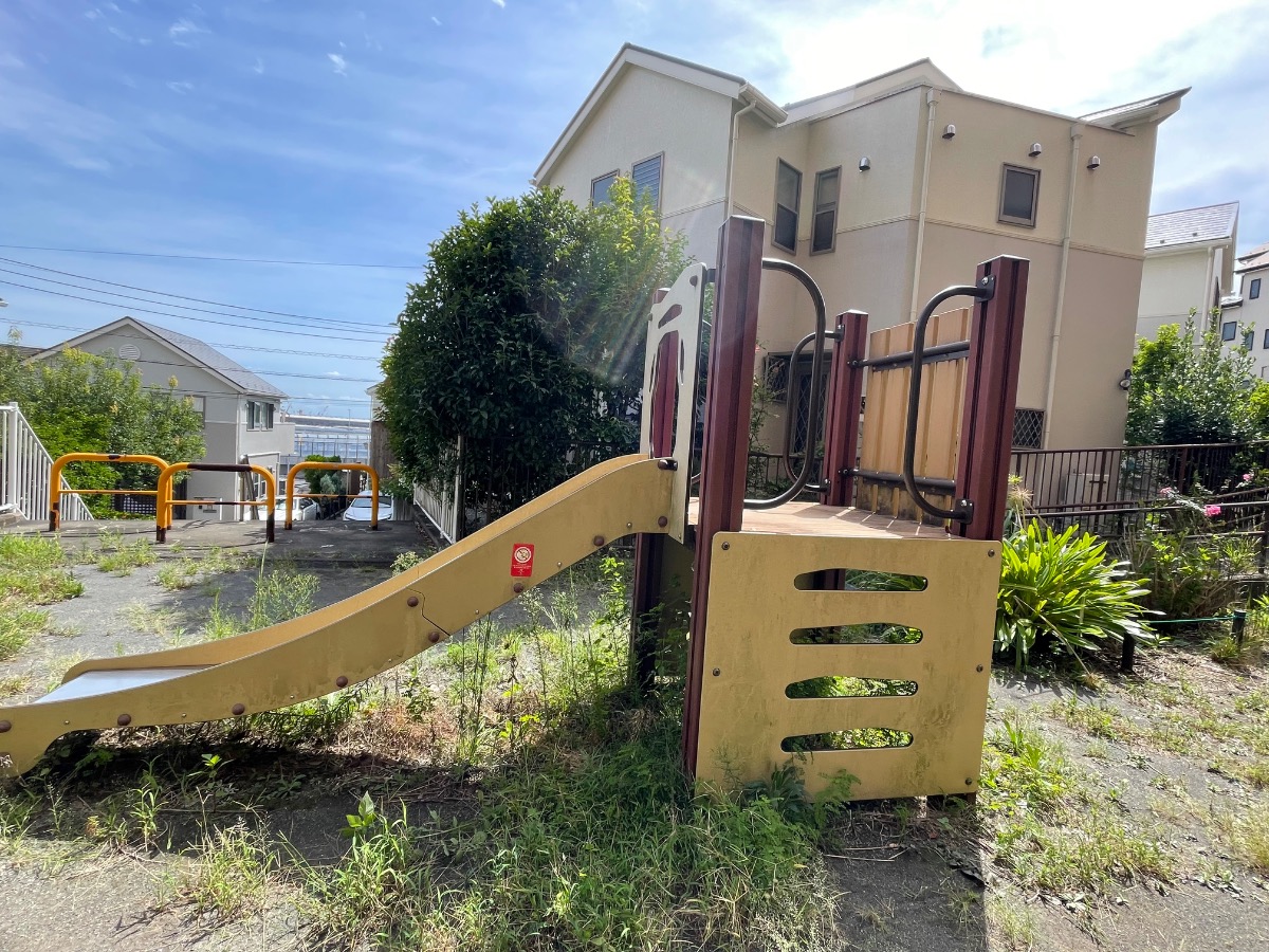 マンションの間にある小さな公園です。少し草が生い茂っていましたが、滑り台や砂場があります。