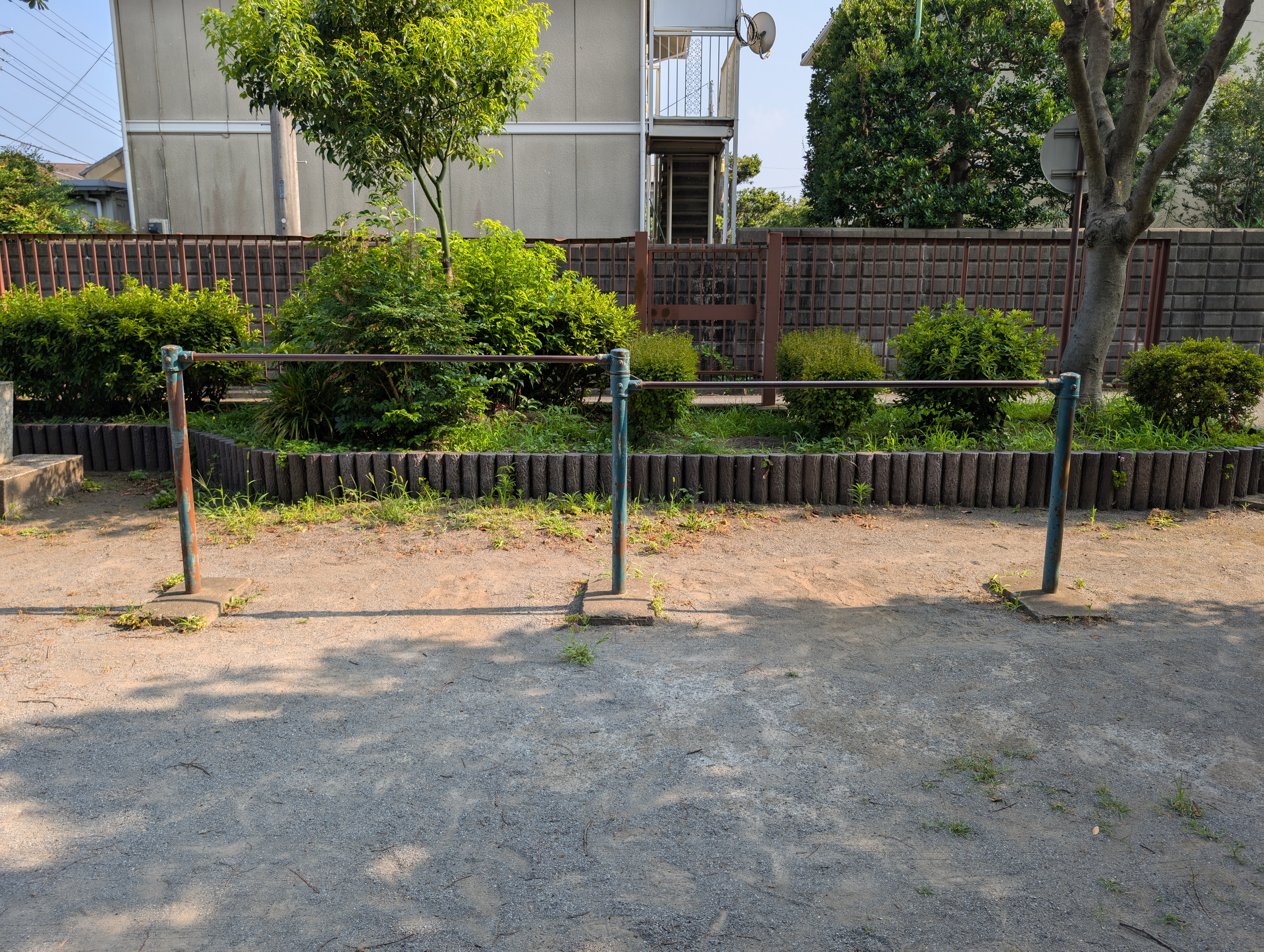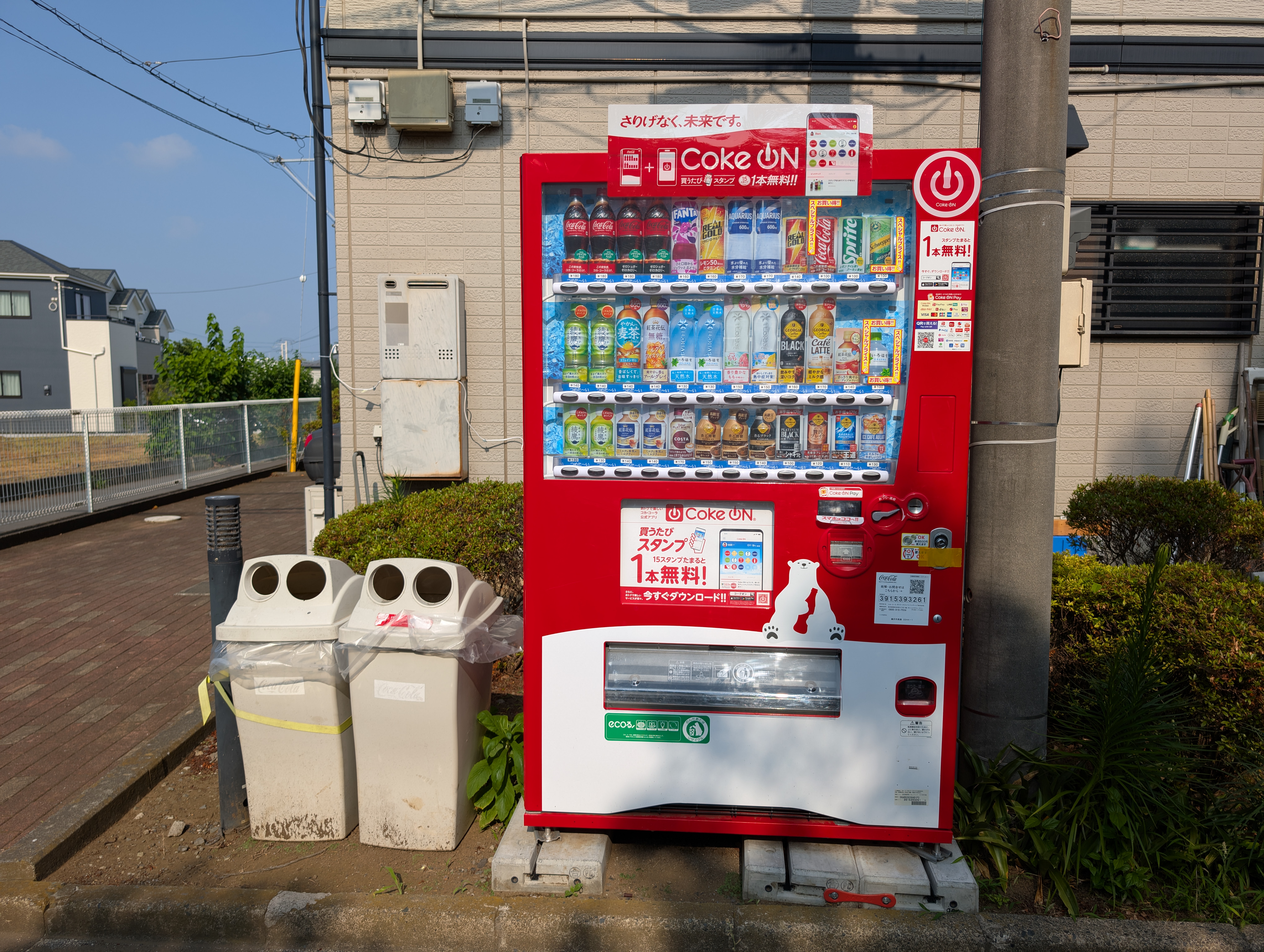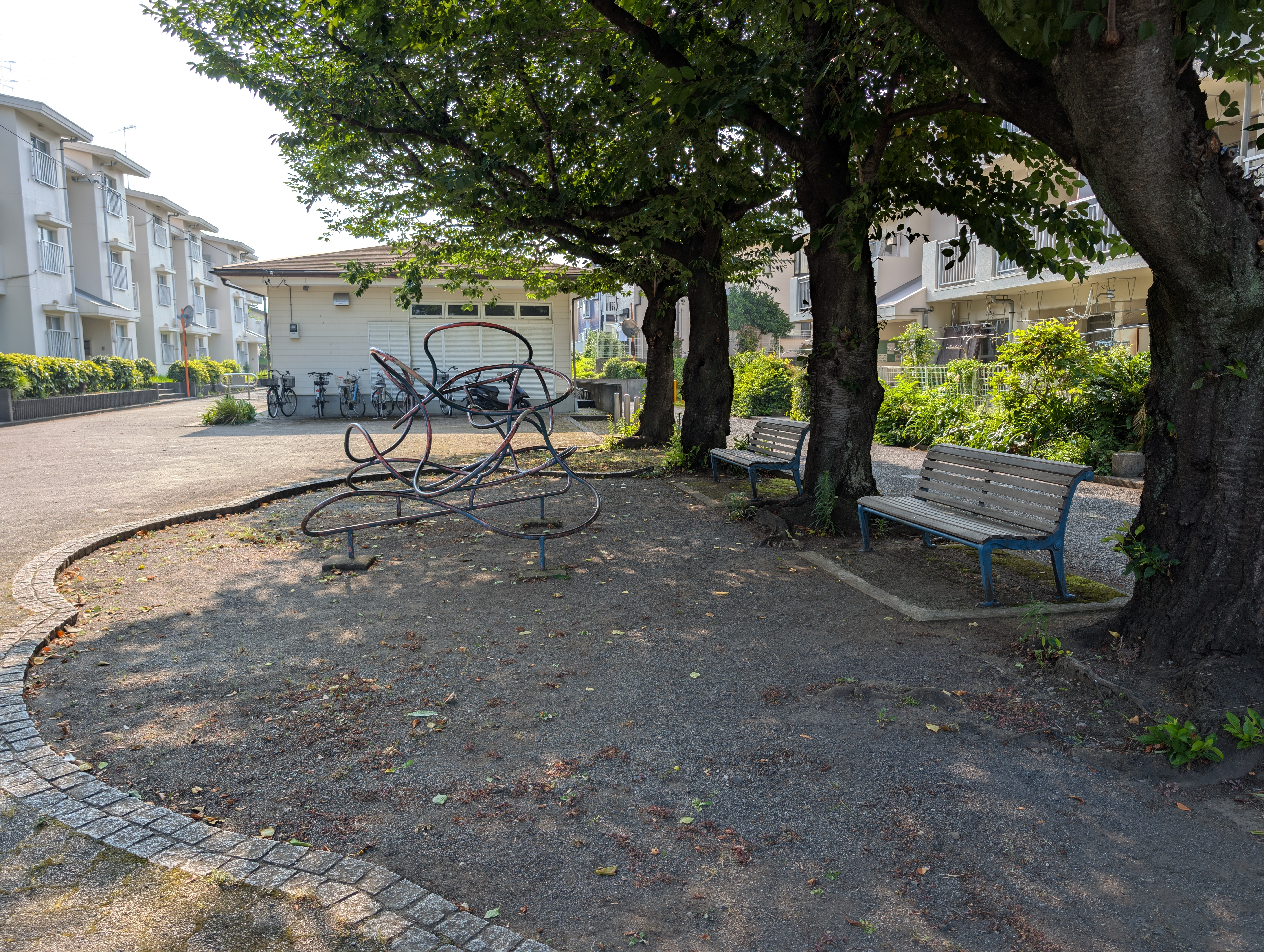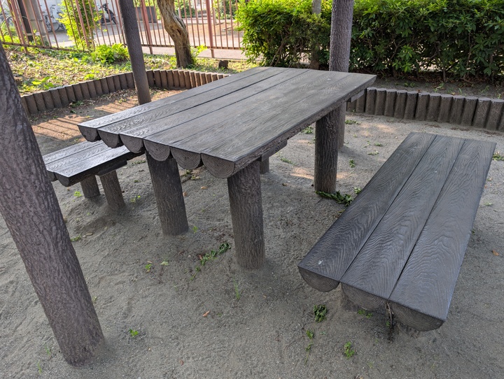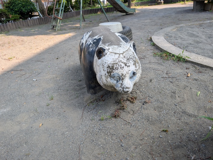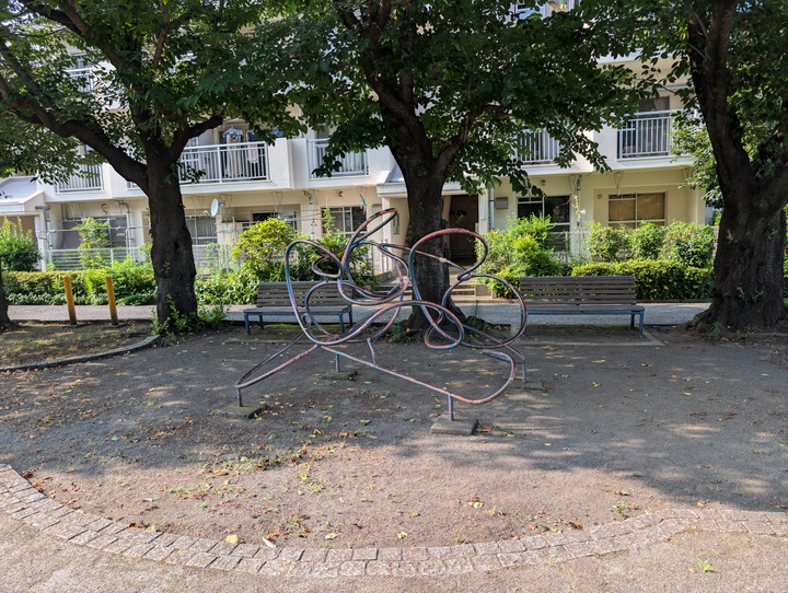 公園のそばに自販機があり、変わった形のジャングルジムもあります。